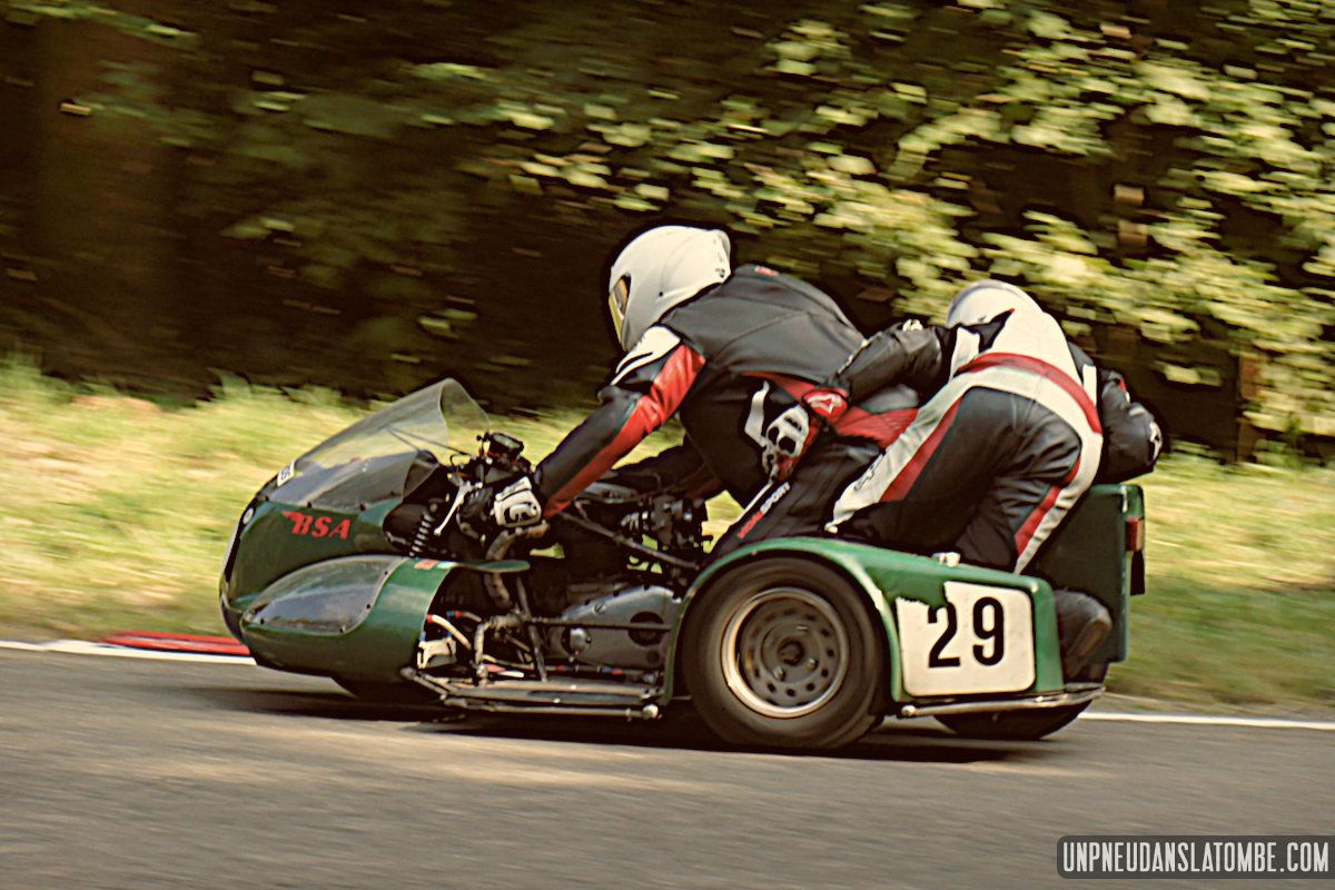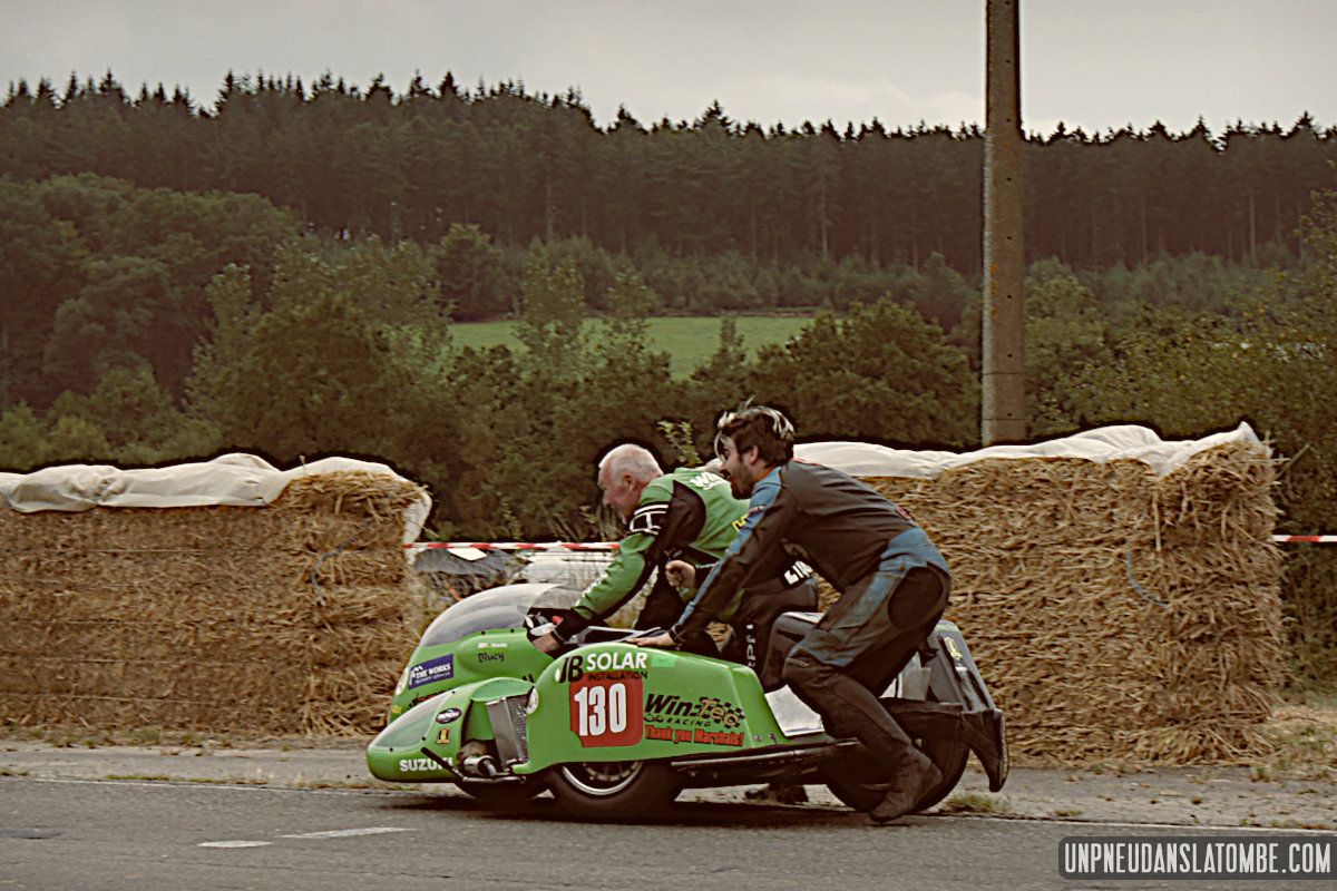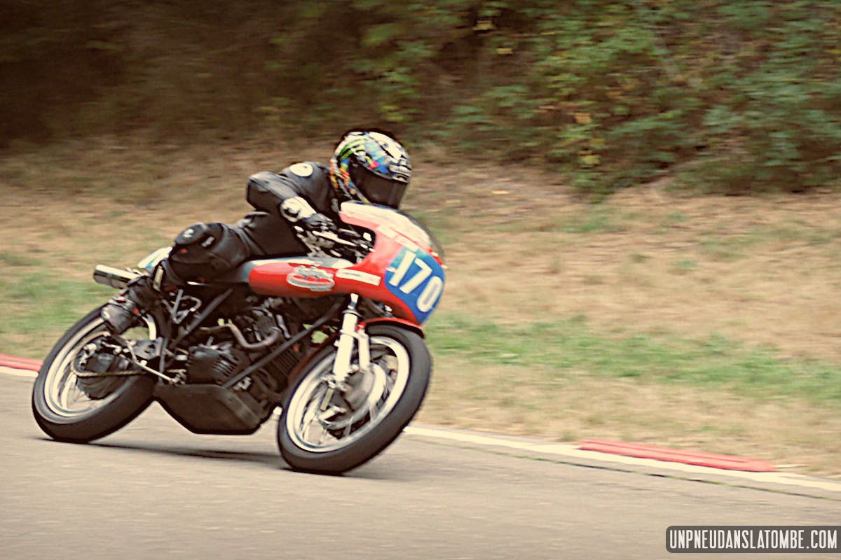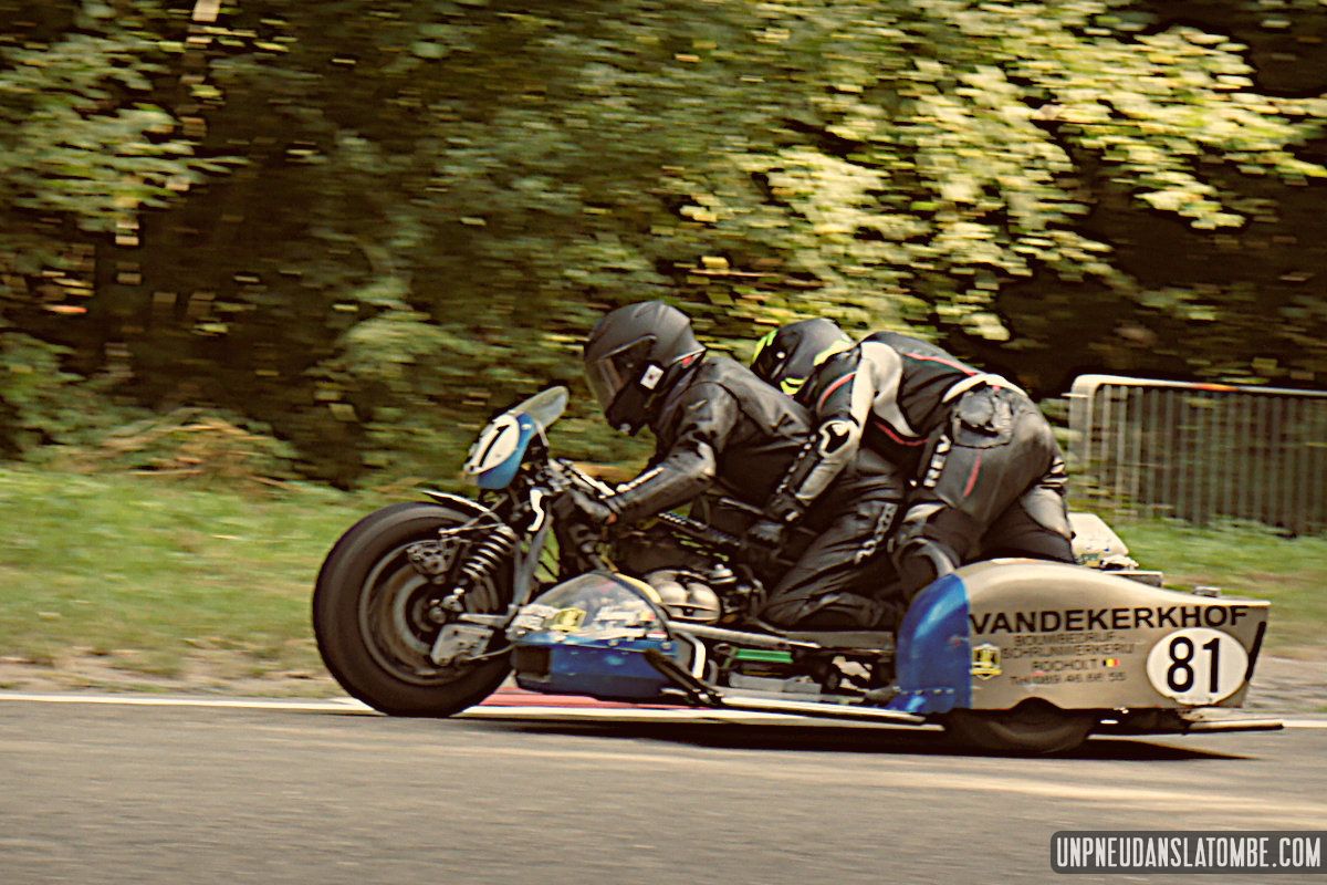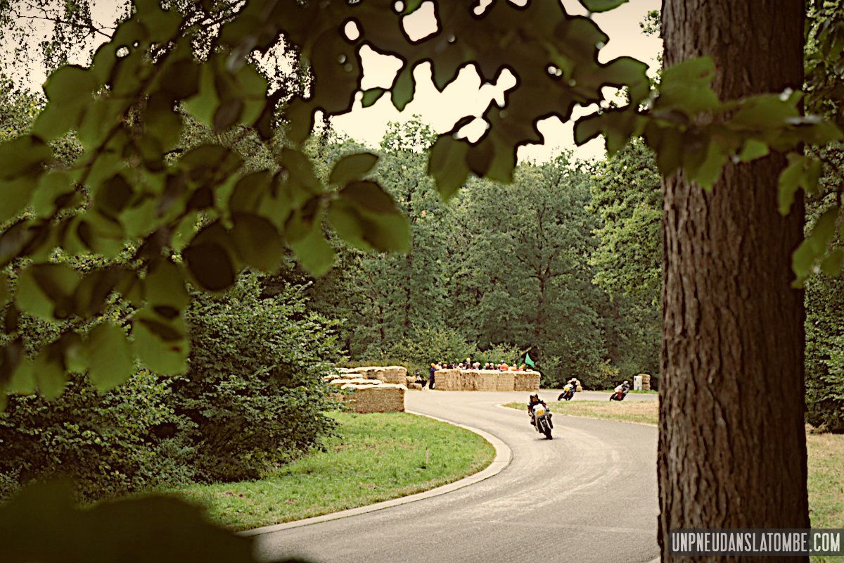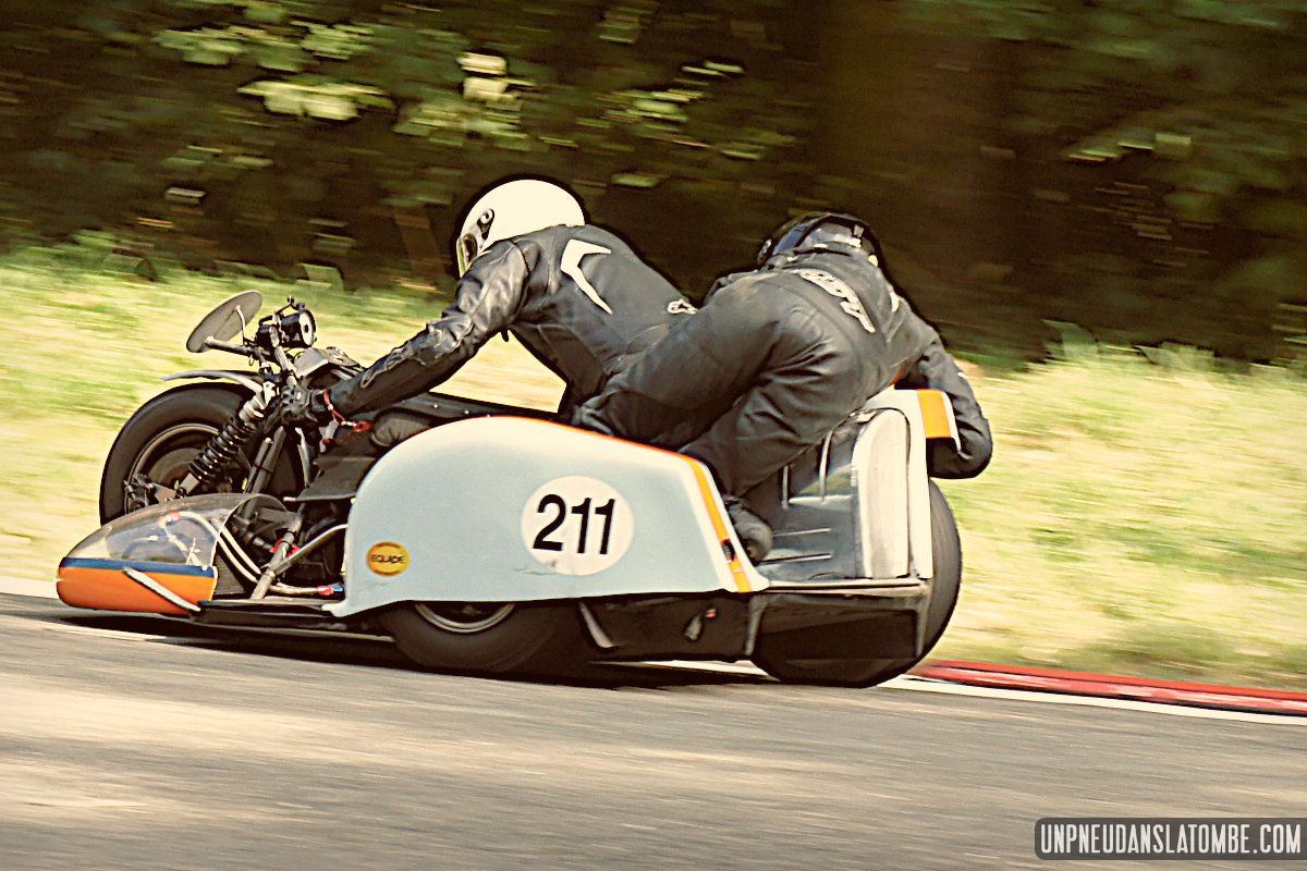 Des courses de motos (et de side-cars), donc, lesquelles s’enchaînent tout le week-end. Et pour nous, témoins de ces affrontements somme toute civilisés, le privilège de pouvoir évoluer autour de la piste entre chaque session. Par conséquent, d’une catégorie à l’autre nous optons pour un nouveau point de vue sur ce circuit à l’ancienne, pour un nouveau virage nous promettant de revivre (par procuration) les frissons d’un succédané du Continental Circus.