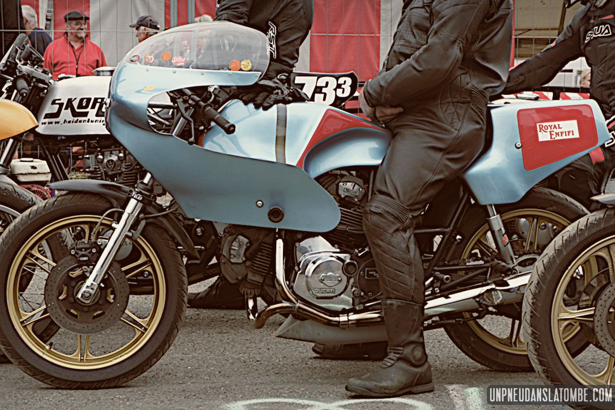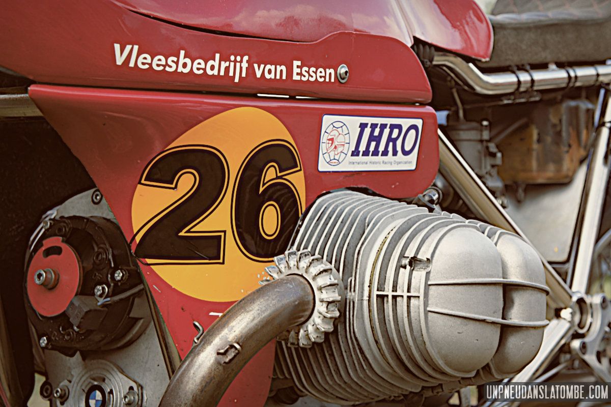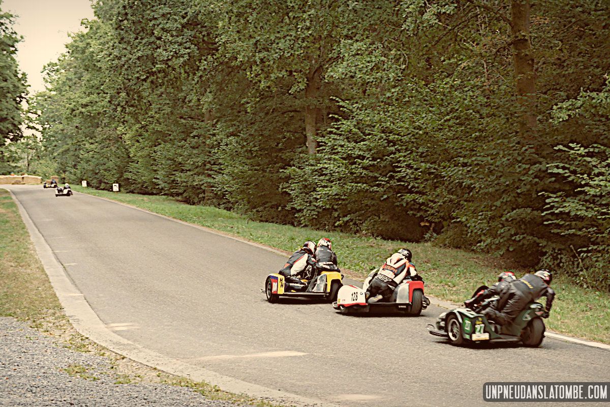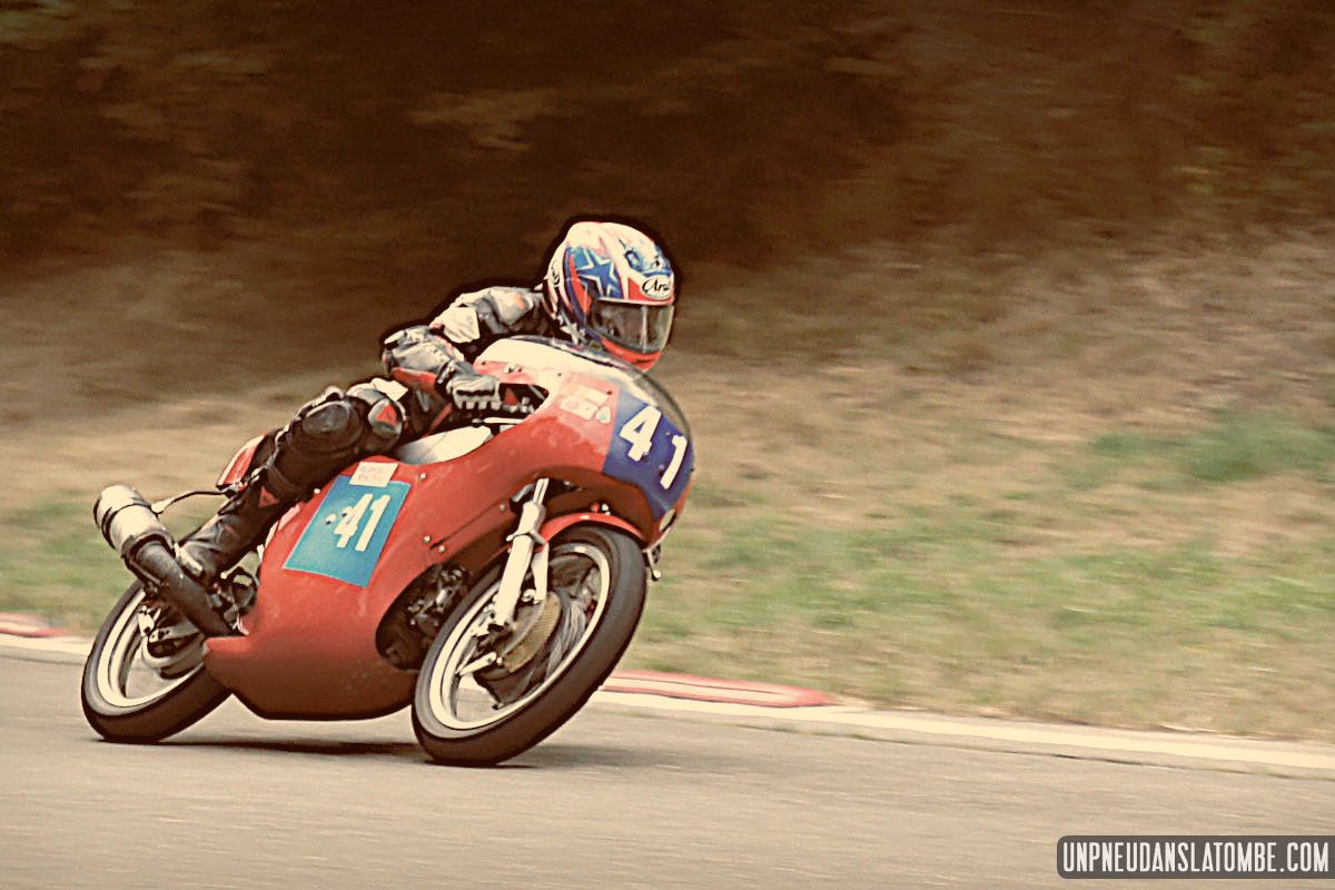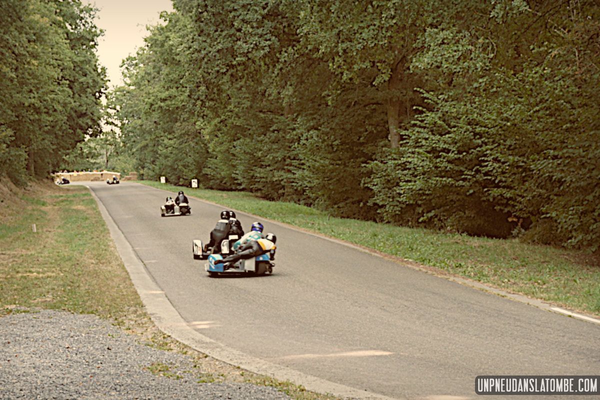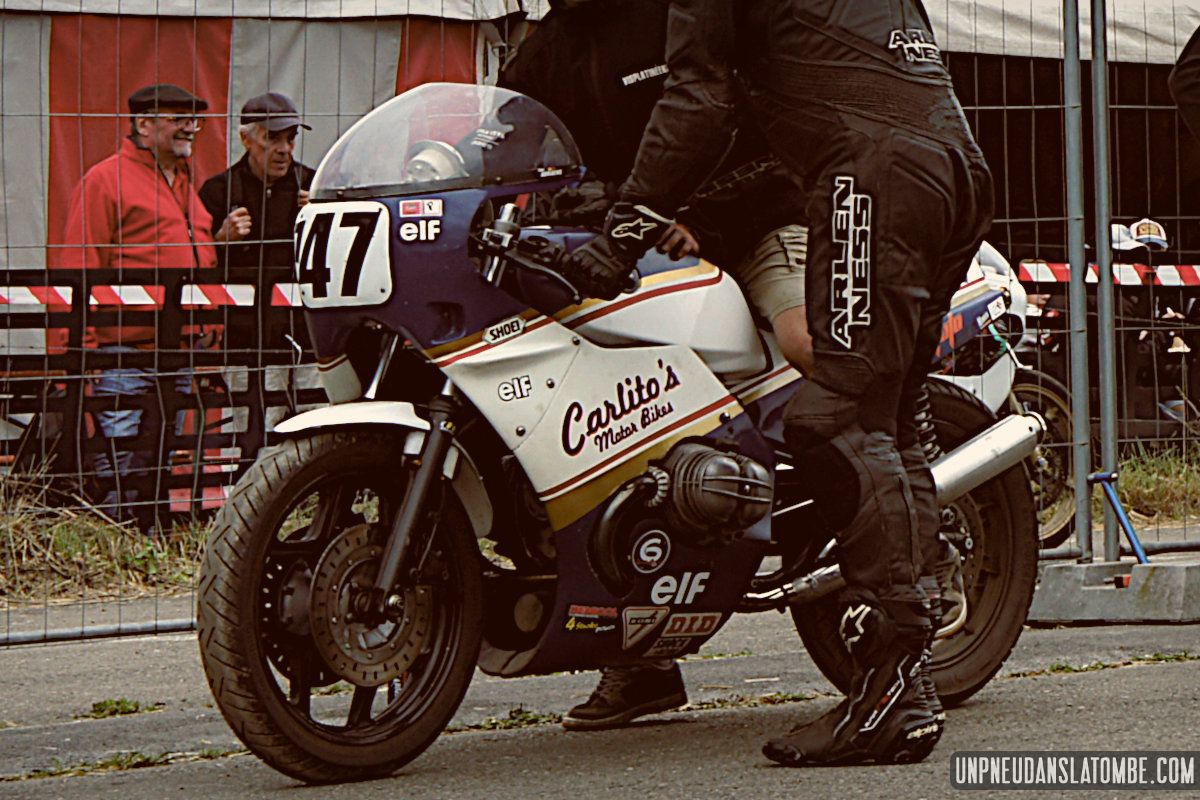 Des courses de motos (et de side-cars), donc, lesquelles s’enchaînent tout le week-end. Et pour nous, témoins de ces affrontements somme toute civilisés, le privilège de pouvoir évoluer autour de la piste entre chaque session. Par conséquent, d’une catégorie à l’autre nous optons pour un nouveau point de vue sur ce circuit à l’ancienne, pour un nouveau virage nous promettant de revivre (par procuration) les frissons d’un succédané du Continental Circus.