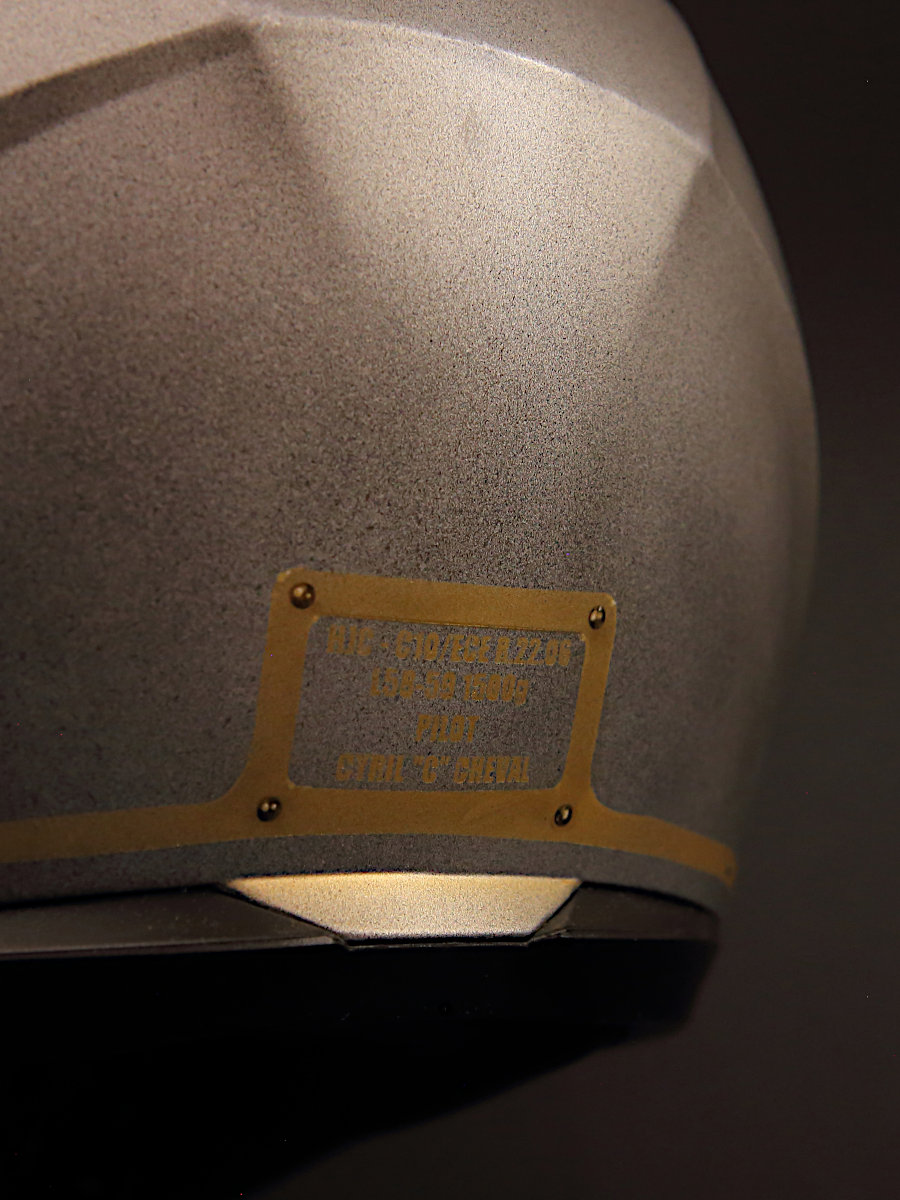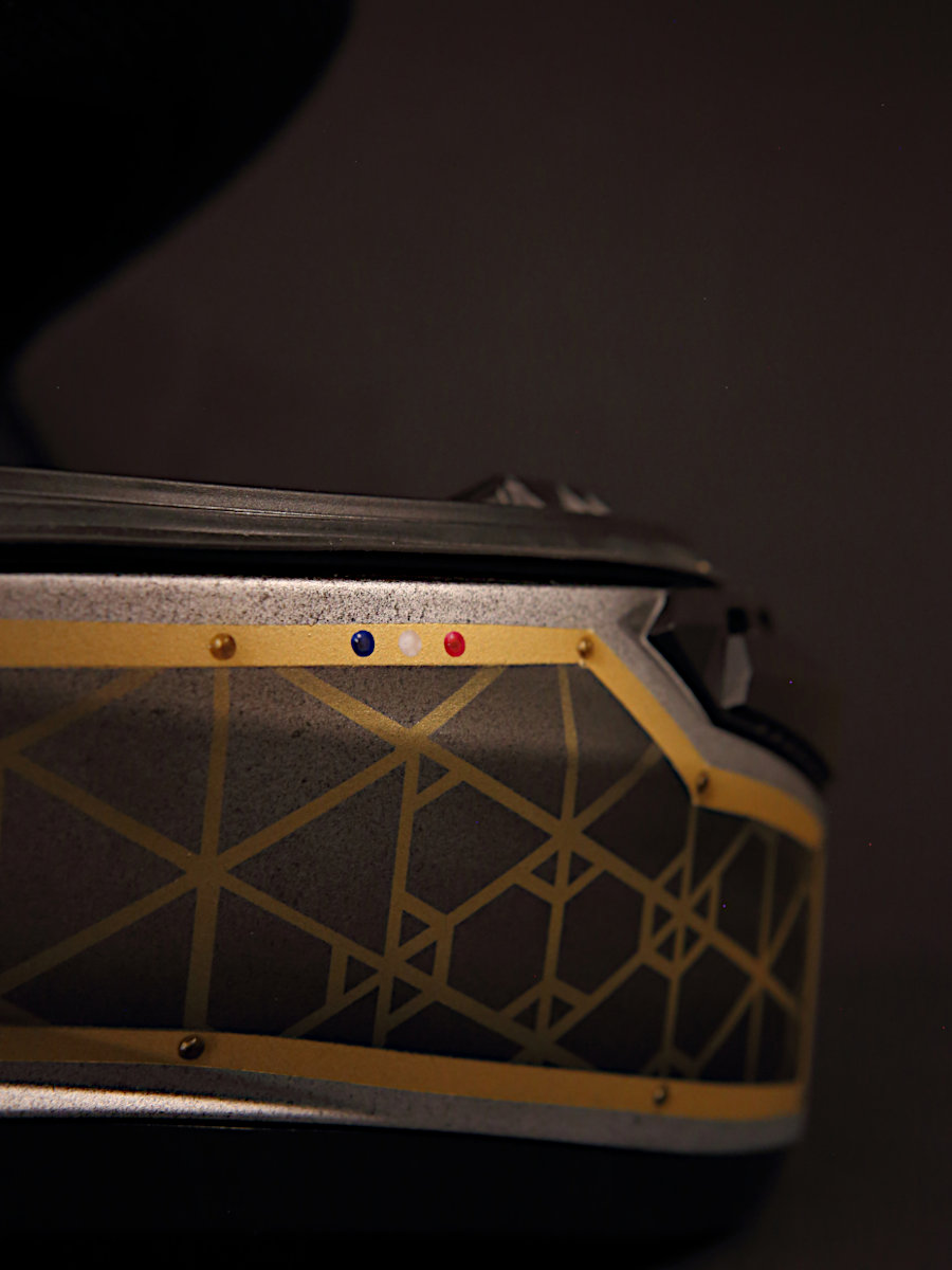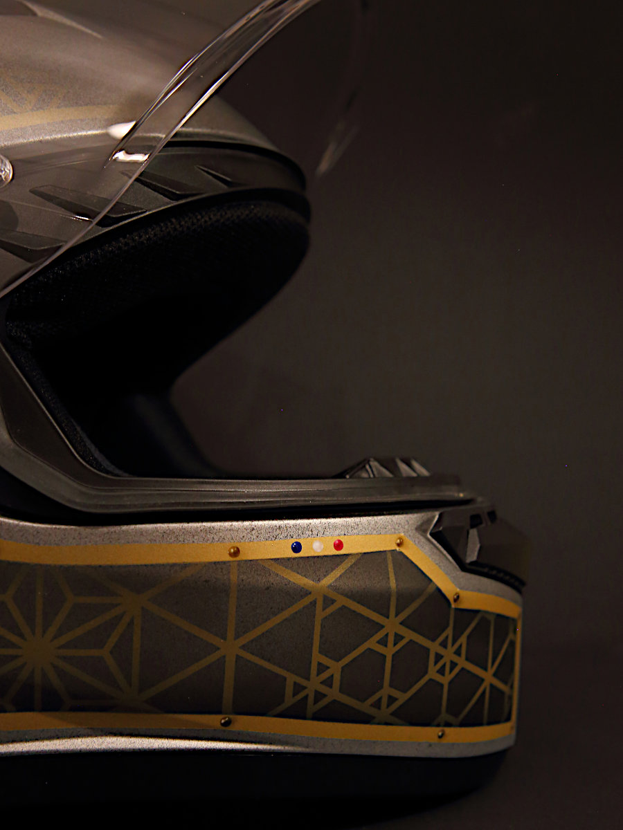 Son couvre-chef, d’abord, a été entièrement démonté. Repeint au pistolet, à l’aérographe et au pinceau, il affiche une déco et des couleurs faisant écho aux formes et aux matières déjà présentes sur la mob de compète que l’on sait. Adrien nous en dit plus :