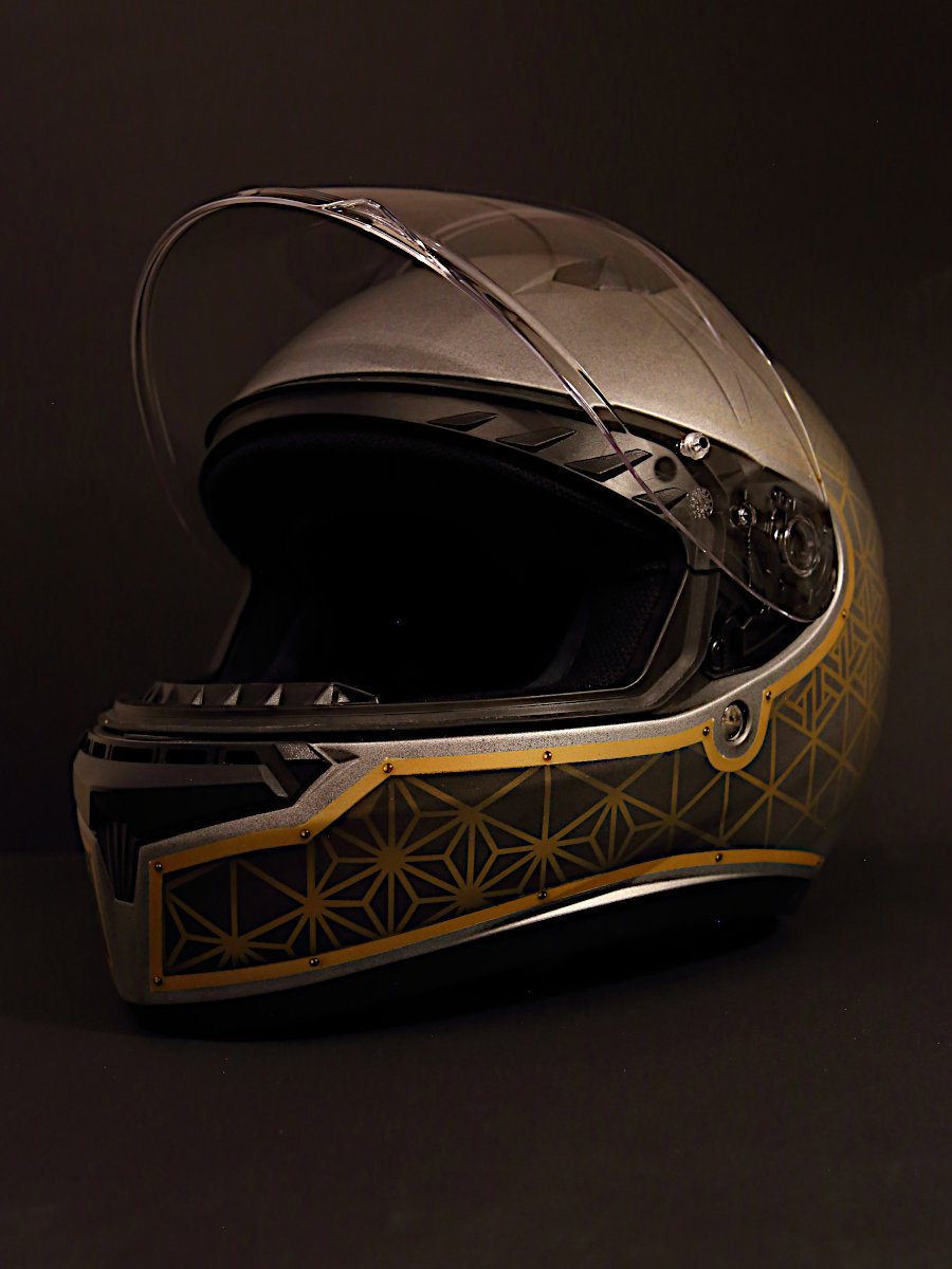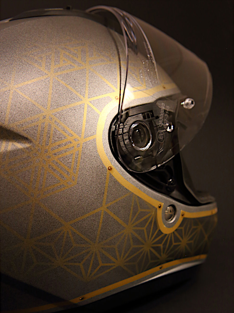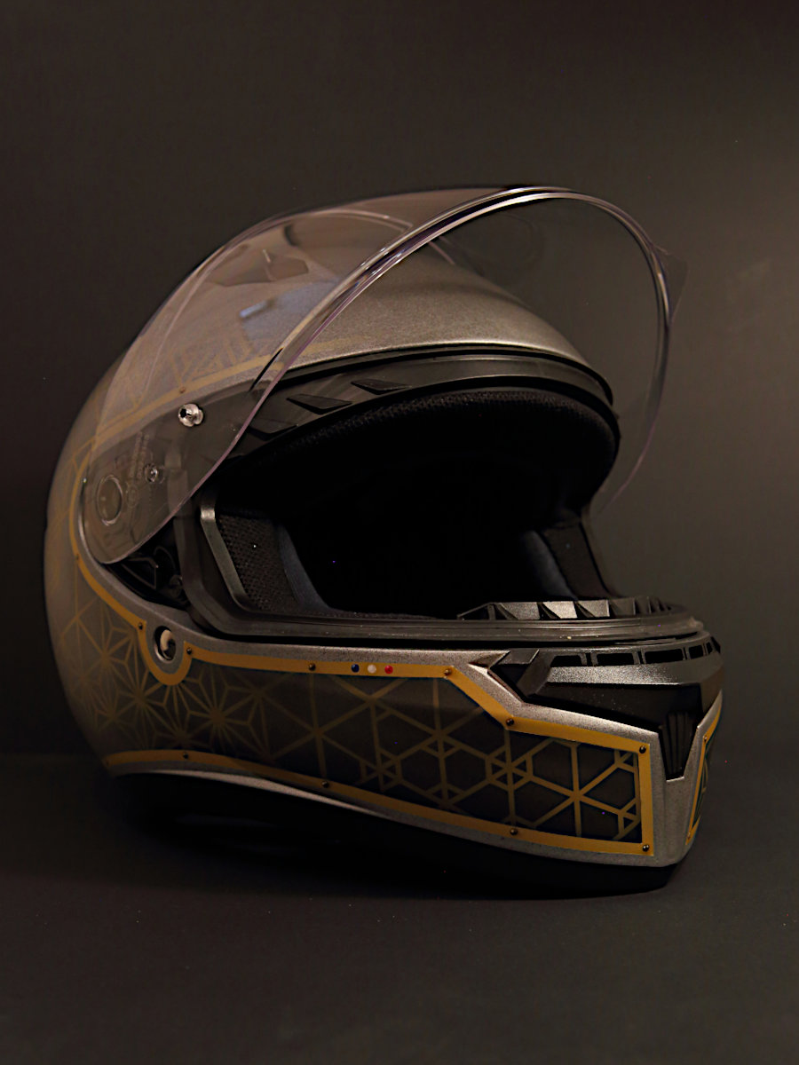 Son couvre-chef, d’abord, a été entièrement démonté. Repeint au pistolet, à l’aérographe et au pinceau, il affiche une déco et des couleurs faisant écho aux formes et aux matières déjà présentes sur la mob de compète que l’on sait. Adrien nous en dit plus :