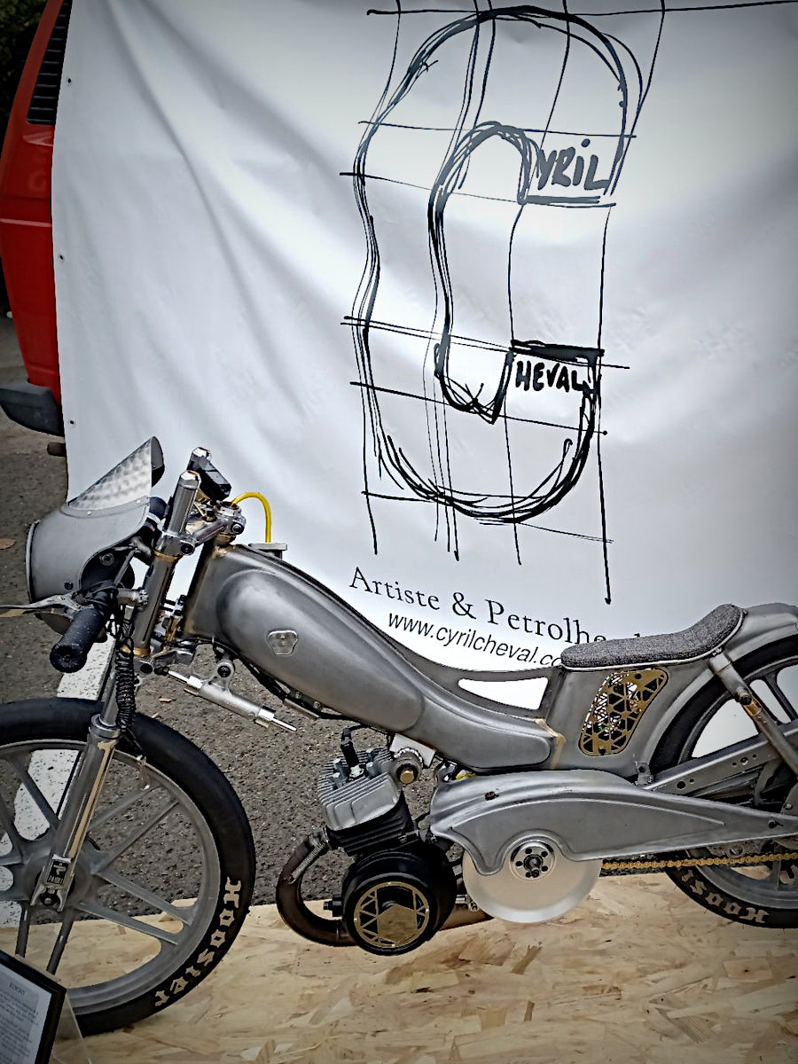 « Je démonte. Je contrôle. Et se faisant je progresse ; encore et encore. Quelques jours plus tard un rassemblement annuel d’anciennes s’organise dans mon village. Je décide d’y emmener mon engin pour une première présentation officielle ; comme pour conjurer le sort. Faire du bruit avec les copains de l’AMA devrait me redonner le sourire. De fait, Jean-Louis (adepte des restaurations méticuleuses) valide l’affaire. Et la plupart des papys (d’ordinaire attachés au boulon originel) saluent ma vision brutale de la Motoconfort AU65 de leur adolescence. »